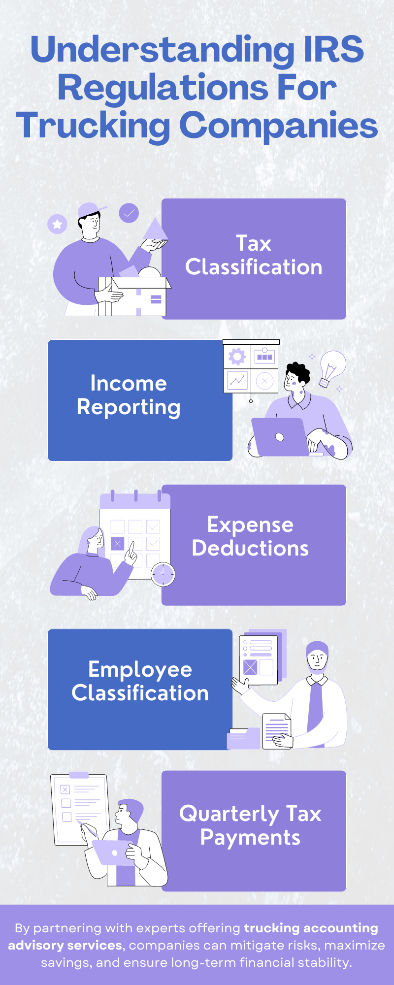 Understanding IRS regulations is vital for the financial health and compliance of trucking companies. By familiarizing themselves with tax classifications, income reporting requirements, expense deductions, and other key aspects of IRS regulations, trucking companies can minimize tax liabilities, maximize tax savings, and avoid potential penalties. To know more visit here https://www.truckersprocpa.ca/trucking-business-advisory-services