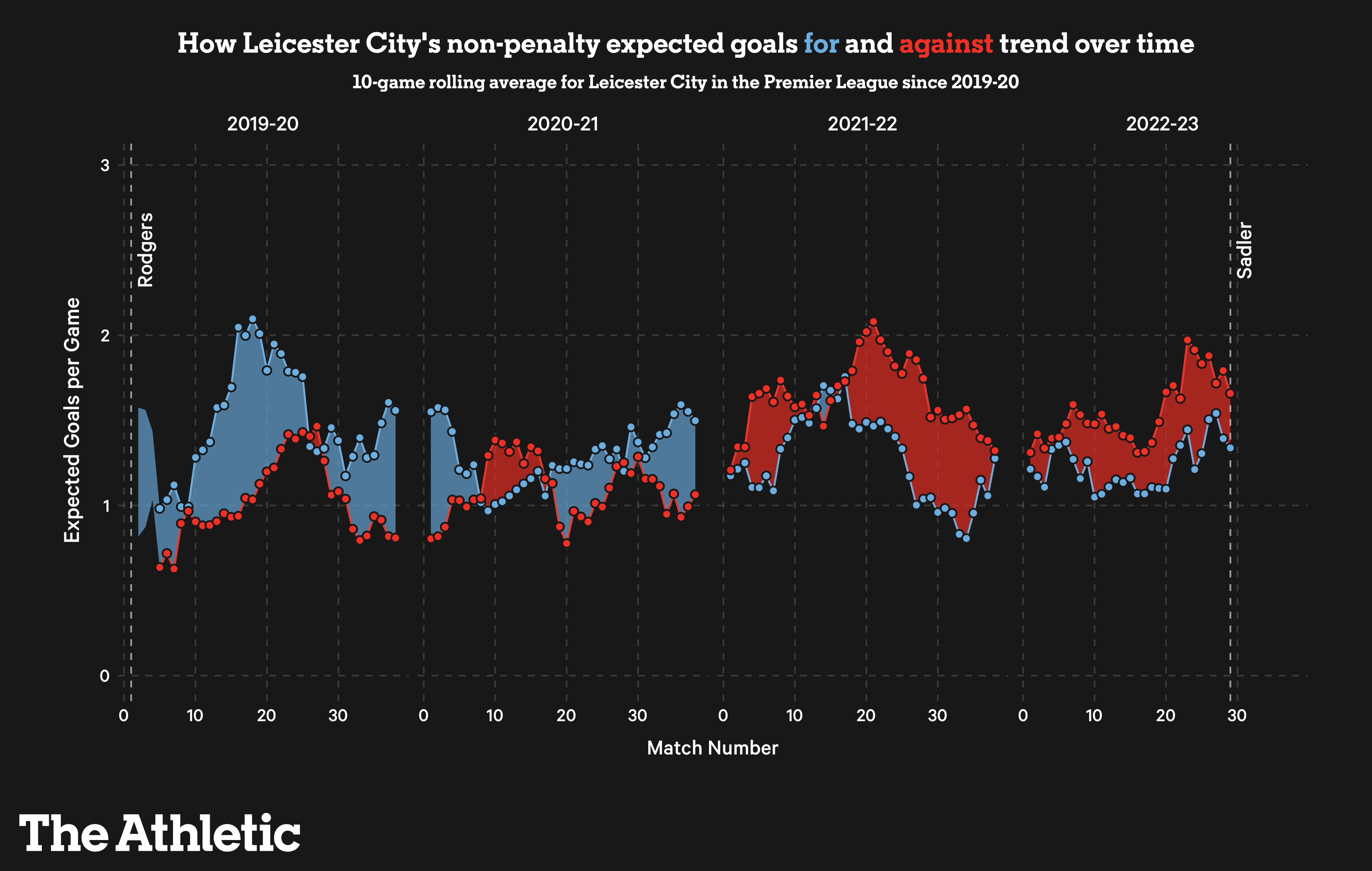 As The Athletic recently explained, Leicester haven’t created better quality chances than they’ve conceded — across a 10-game average — since the start of last season.
