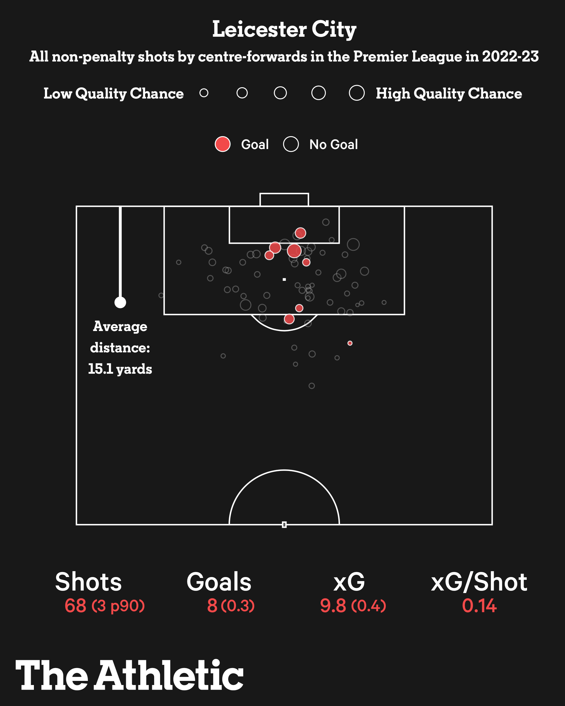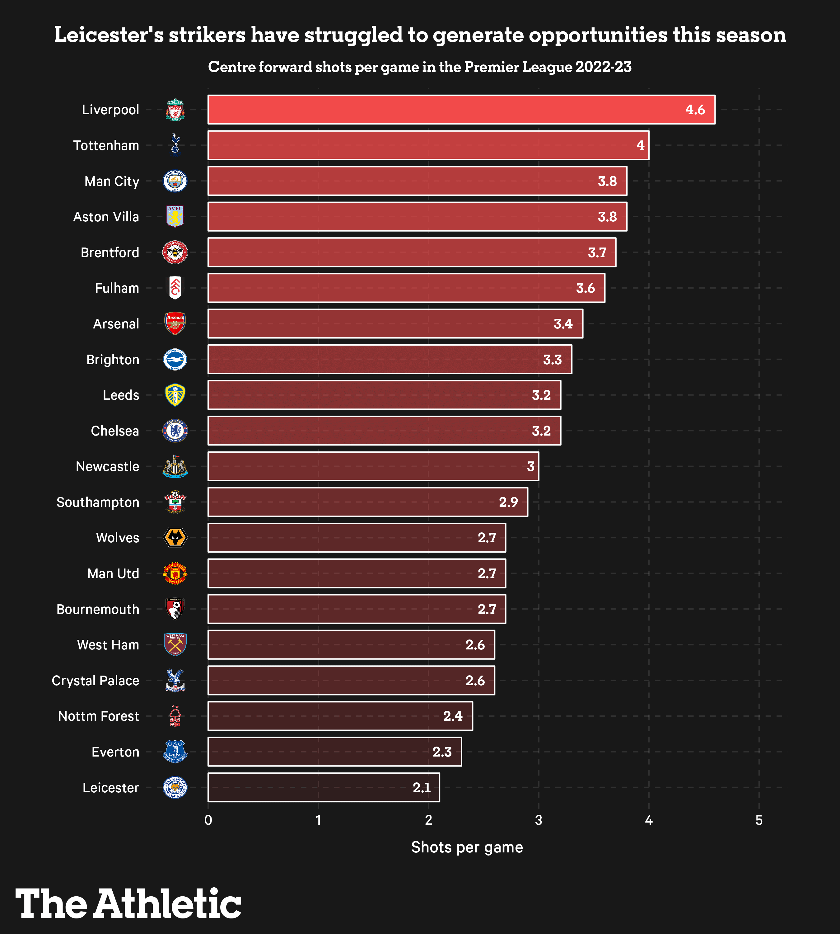 Leicester’s strikers (Vardy, Daka and Iheanacho) have taken fewer shots per 90 minutes than their counterparts at any other club in the division this season and have scored just eight league goals between them.