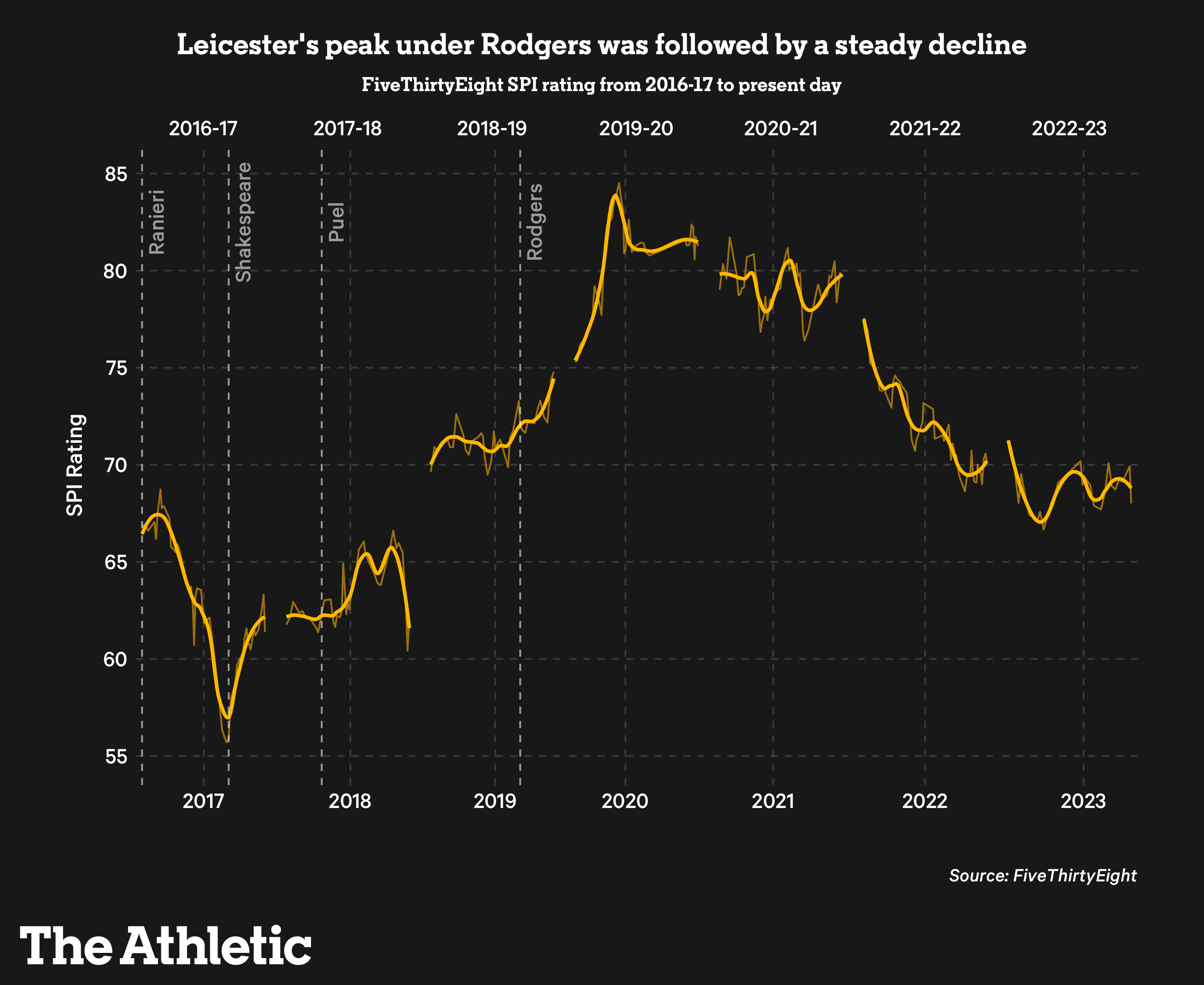 To track Leicester’s decline under Rodgers, we can turn to FiveThirtyEight’s Soccer Power Index (SPI) ratings, which estimate a team’s overall strength between zero and 100 — using difficulty-adjusted match results and underlying performance metrics to model a team’s offensive and defensive strength.