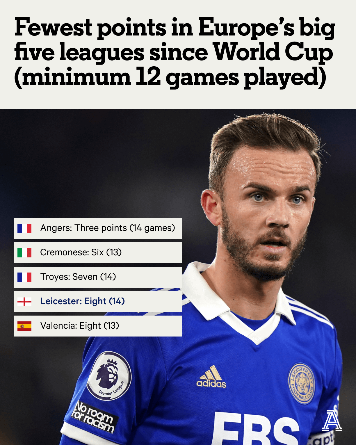 Leicester have also become unable to bounce back into games when behind or hold onto leads when ahead, dropping a league-worst 22 points from winning positions this season and only gaining eight from losing ones (sixth-least in the league).
