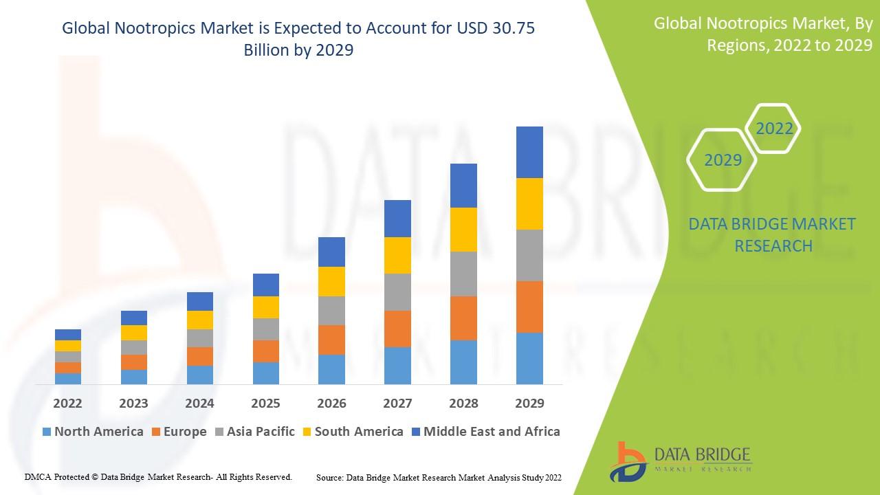 Data Bridge Market Research analyses that the nootropics market was valued at USD 10.90 billion in 2021 and is expected to reach USD 30.75 billion by 2029, registering a CAGR of 13.85% during the forecast period of 2022 to 2029.