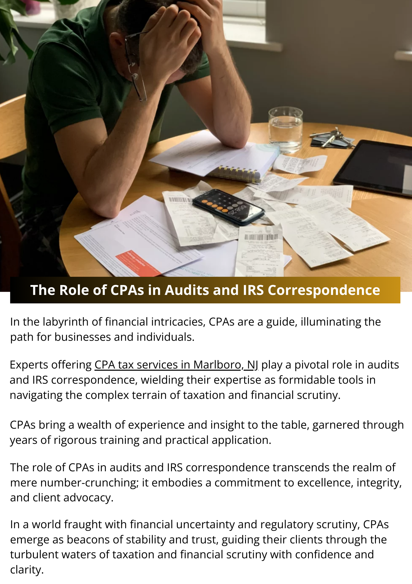 The role of CPAs in audits and IRS correspondence transcends the realm of mere number-crunching; it embodies a commitment to excellence, integrity, and client advocacy. As guardians of financial integrity, CPAs stand as sentinels, safeguarding the interests of their clients and ensuring compliance with regulatory requirements. To know more visit here https://www.straighttalkcpas.com/cpa-services-marlboro-nj