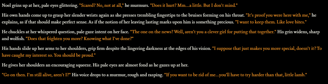 TW: darker themes. You can see the effect the writing style prompt has pretty clearly in these. Although, honestly, I think the writing style prompt has alot to do with the initial message. Look for a bot with italics/em-dashes/punchy sentences if you want that sort of writing throughout the roleplay.