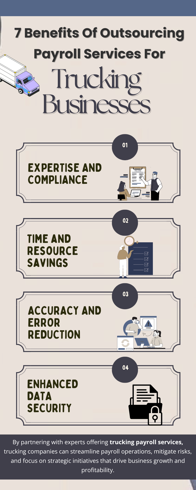 Outsourcing payroll services offers numerous benefits for trucking businesses, including increased accuracy, regulatory compliance, time and cost savings, streamlined operations, access to expertise and technology, enhanced data security, and scalability. By leveraging advantages, trucking companies can improve their payroll management, reduce administrative burdens, and focus on their core business operations. To know more visit here https://www.truckersprocpa.ca/trucking-payroll-services