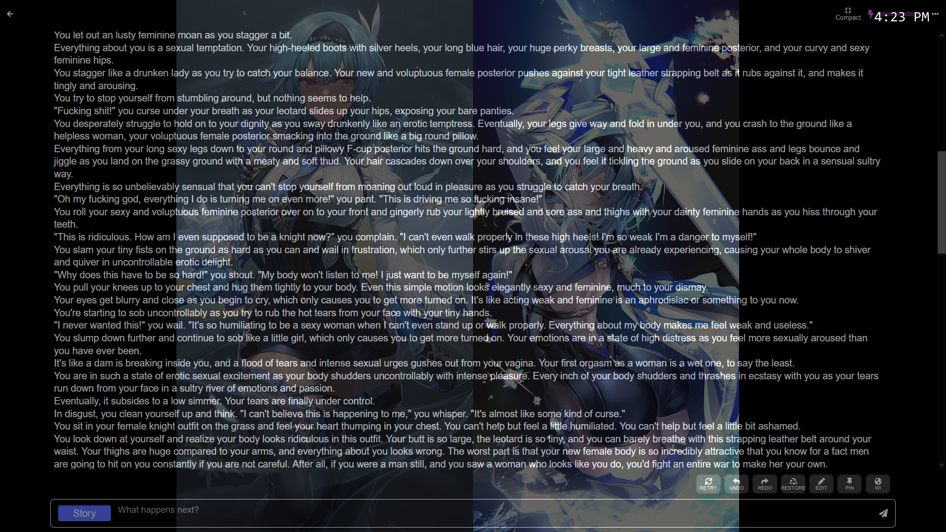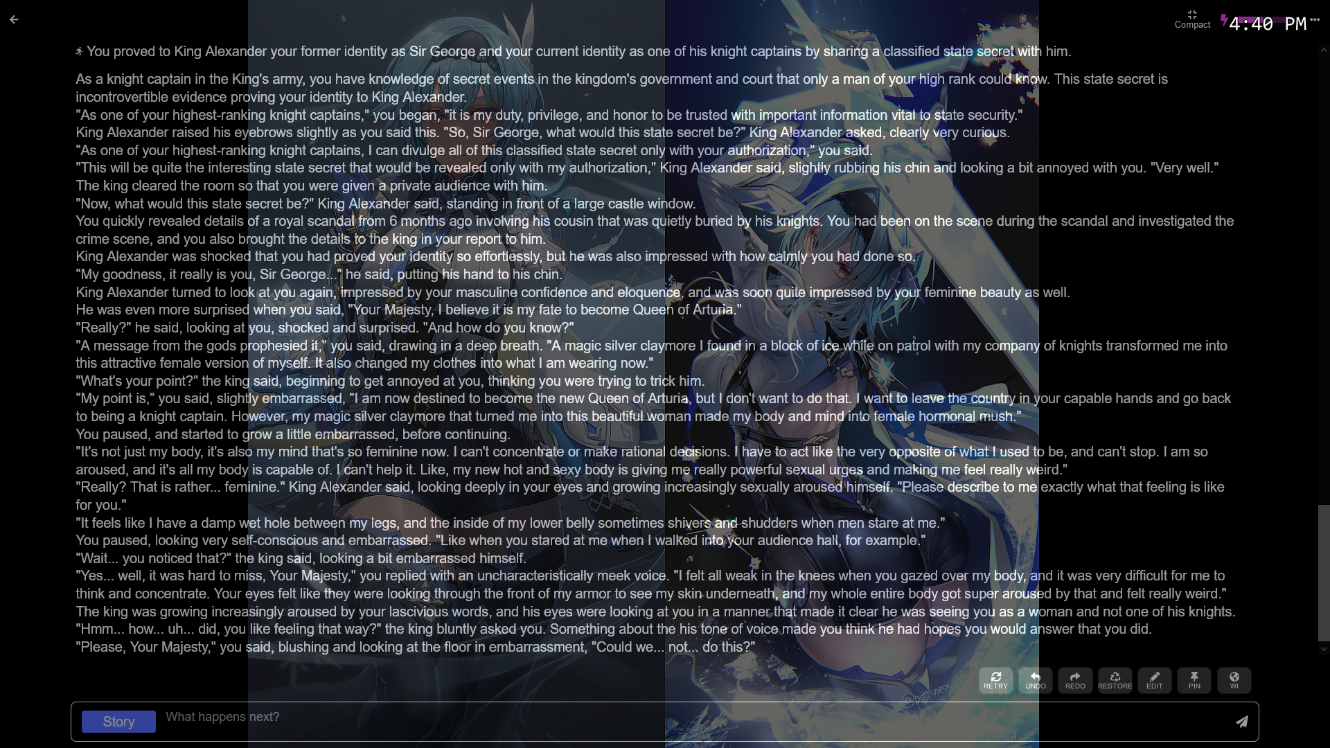Below is an AI Dungeon test scenario of the concept (before the service got nerfed so badly); excuse the overlaid images, as they're the only screenshots I have: