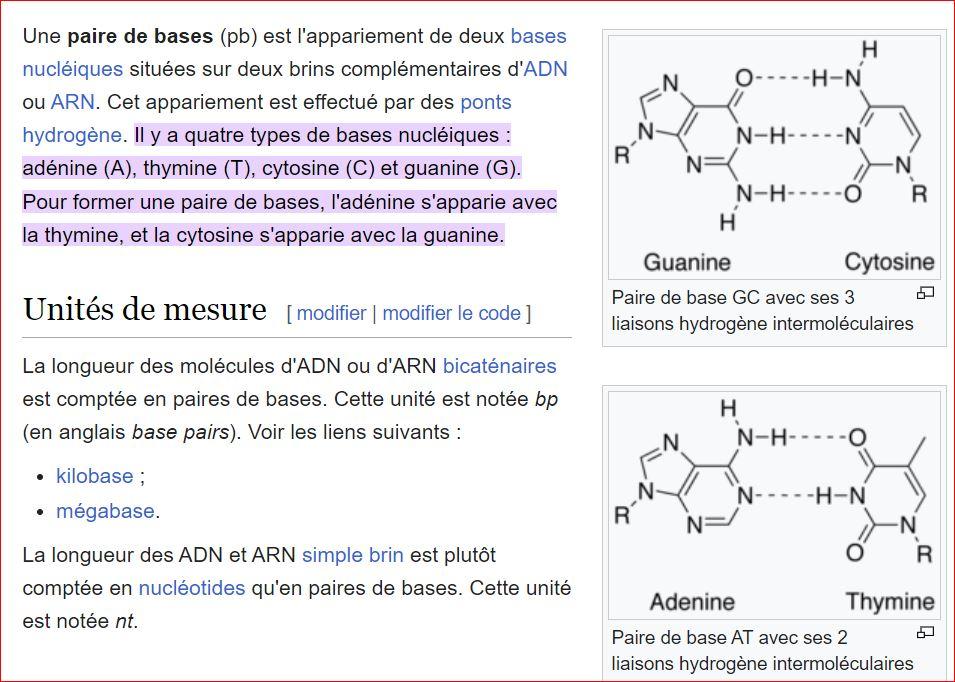 Il est composé de quatre éléments complémentaires, appelés les bases nucléotides qui sont : l’adénine, la thymine, la guanine et la cytosine (ou A, T, G, C). Ces bases ne s'associent que par 2, A et T, G et C.