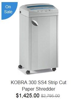 Our Kobra 300 Paper Shredder is a great solution for small to medium sized businesses who need to securely destroy confidential documents. The Kobra 300 can handle up to 24 sheets at a time and has a waste bin capacity of 11 gallons. It's also equipped with an auto start/stop function, which makes it easy to use.