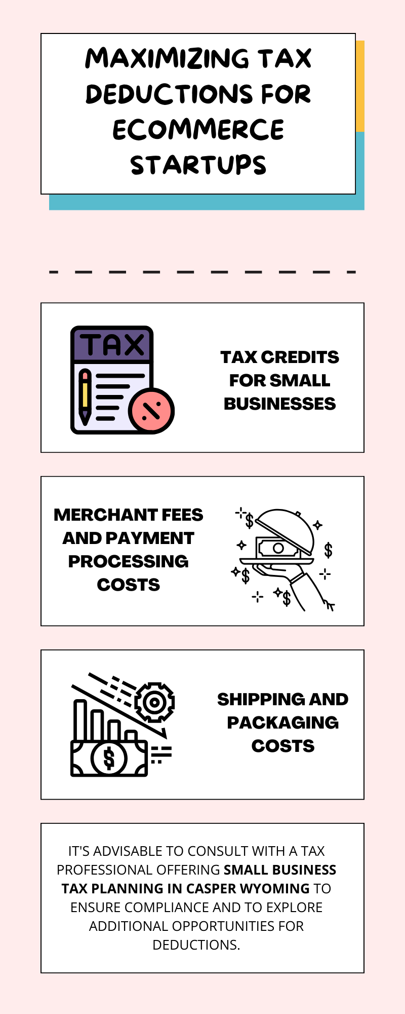 Maximizing tax deductions for eCommerce startups requires meticulous record-keeping and a proactive approach to staying informed about tax regulations. By strategically leveraging available deductions, eCommerce entrepreneurs can optimize their financial position, foster growth, and build a solid foundation for long-term success. To know more visit here https://www.straighttalkcpas.com/business-tax-planning-casper-wyoming