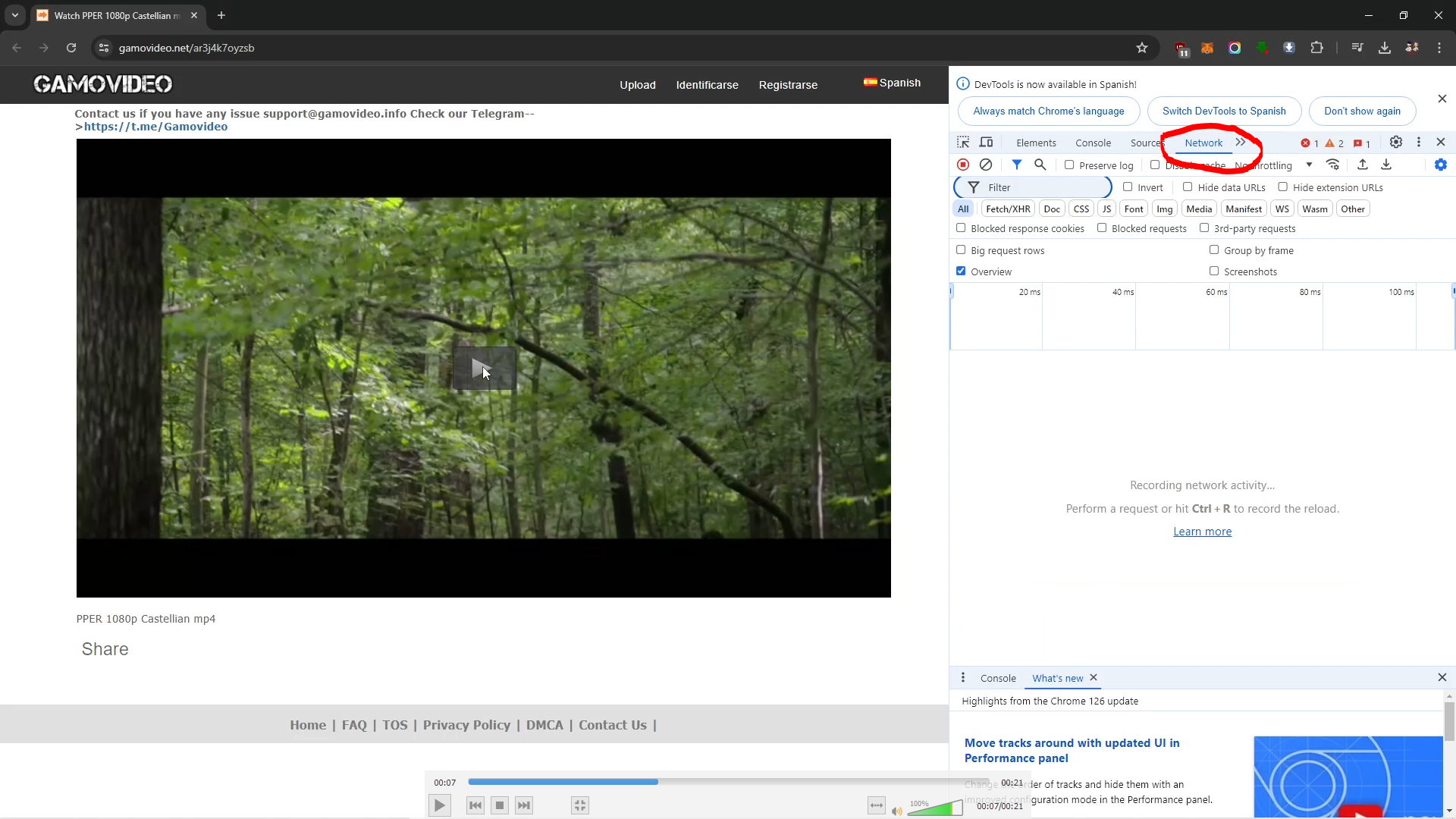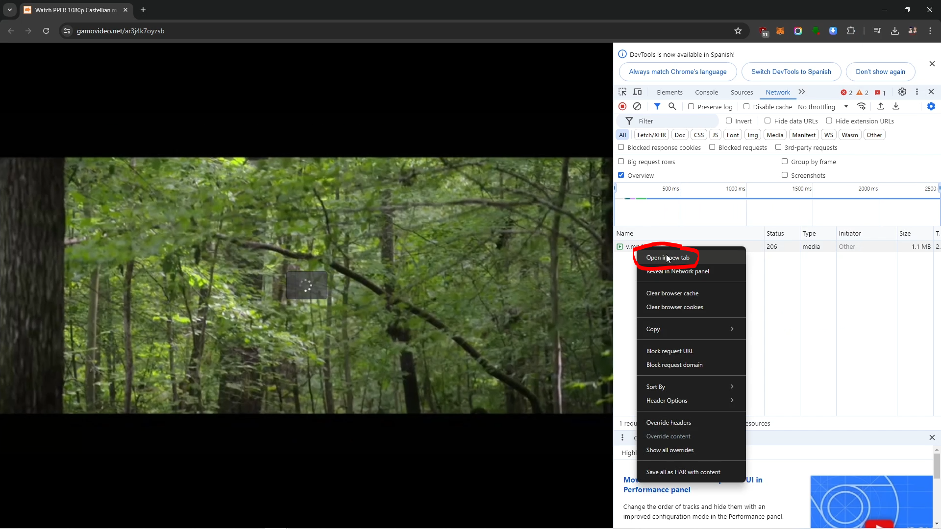 - Una vez estamos en network le damos a el boton play para que se reproduzca la película y te aparecerá un archivo llamado v.mp4 en verde le damos doble clic y si no comienza la descarga clic derecho y open in new tab como veremos en la siguiente imágen: