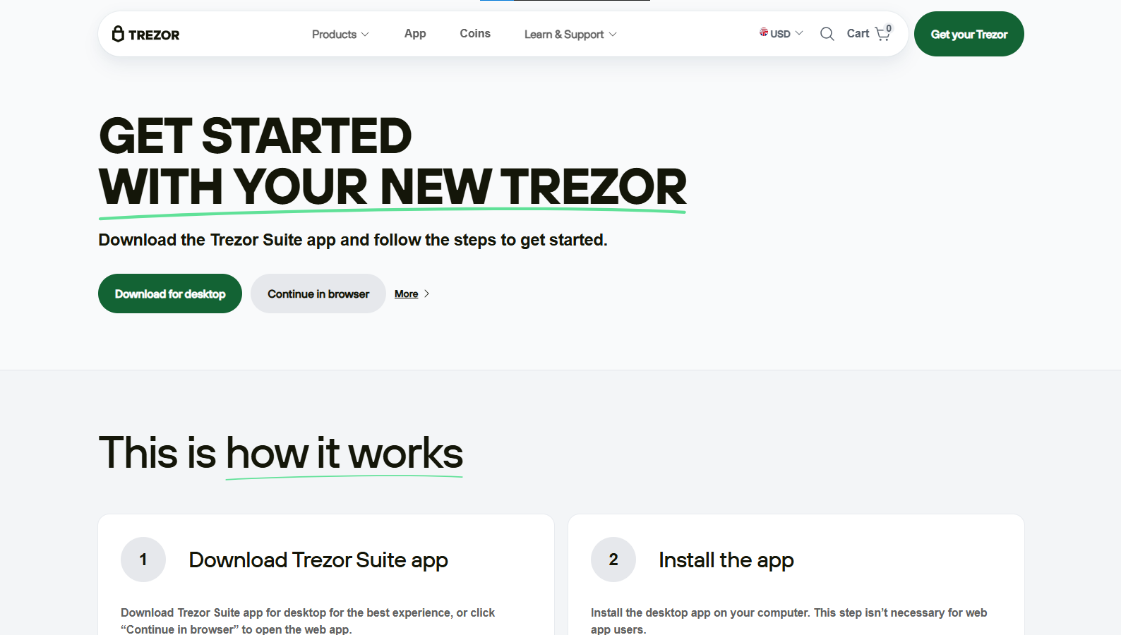 Start by plugging your Trezor wallet into your computer or phone using the cable provided. Once connected, you’ll be directed to Trezor.io/start in your browser.