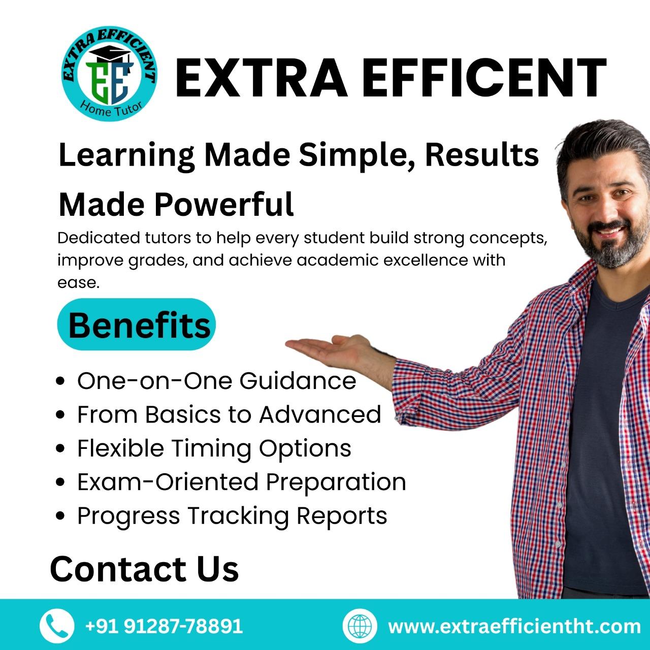At Extra Efficient, we believe that every student learns differently. Our home tutors focus on concept clarity, regular practice, and personal attention—helping students strengthen their weak areas and build confidence. Whether it’s school subjects, board exams, or competitive preparations, our experienced tutors ensure complete academic support at home.