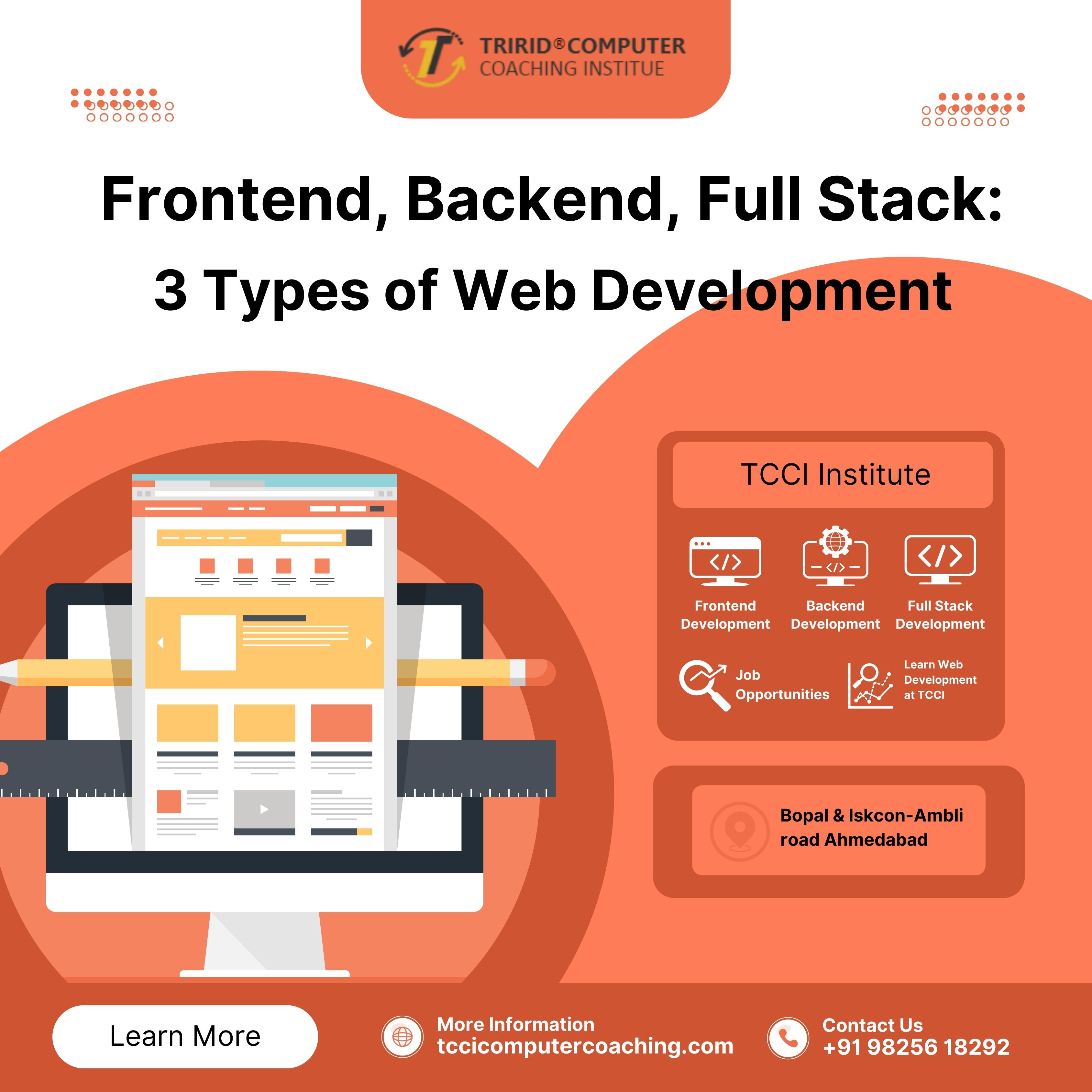 Frontend Backend Full Stack 3 Types of Web Development are essential skills in today’s digital age, enabling developers to build interactive websites and applications. The TCCI-Tririd Computer Coaching Institute provides expert training in Frontend, Backend, and Full Stack Development, helping students master the entire web development cycle.