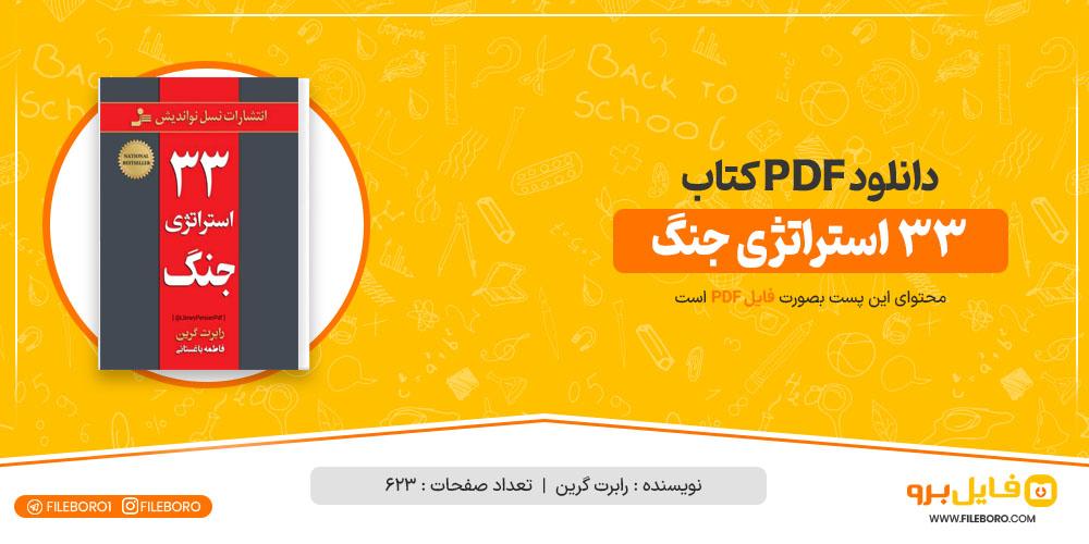 وب سایت فایل برو پی دی اف کتاب ۳۳ استراتژی جنگ رابرت گرین 623 صفحه را برای شما دوستان آماده کرده است. کتاب 33 استراتژي جنگ ذهن شما را تربيت ميکند تا با توجه به شرايط خود و دشمن، کارآمدترين استراتژي را انتخاب کرده و با کمترين تلفات و خسارت به بزرگترين پيروزيها برسيد. اين اثر عصاره و جوهر خرد بيانتهايي است که در درسها و اصول جنگ وجود داشته است. با سایت فایل برو همراه باشید.