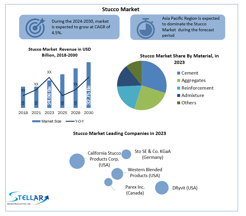Stucco Market is expected to reach USD 32.75 Bn. in 2030 from USD 24.06 Bn in 2023 at a CAGR of 4.5% during the forecast period.