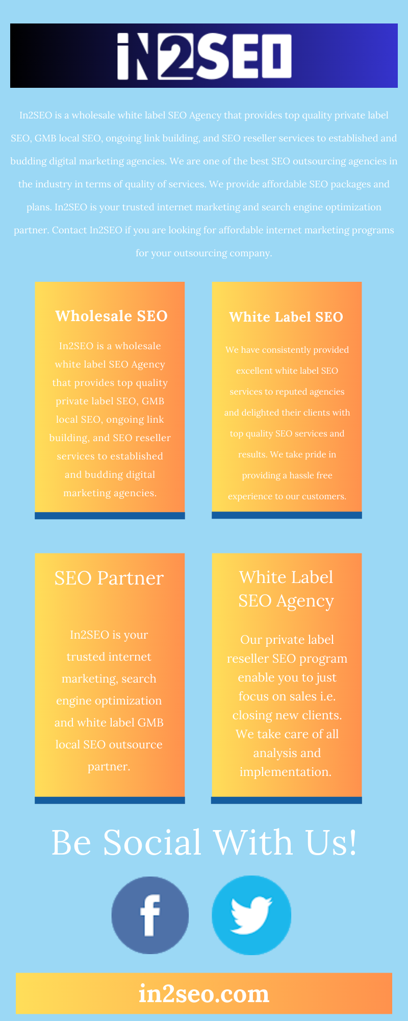 In2SEO is a wholesale white label SEO Agency that provides top quality private label SEO, GMB local SEO, ongoing link building, and SEO reseller services to established and budding digital marketing agencies. We are one of the best SEO outsourcing agencies in the industry in terms of quality of services. We provide affordable white label SEO packages and plans. In2SEO is your trusted internet marketing and search engine optimization partner. Contact In2SEO if you are looking for affordable internet marketing programs for your outsourcing company.