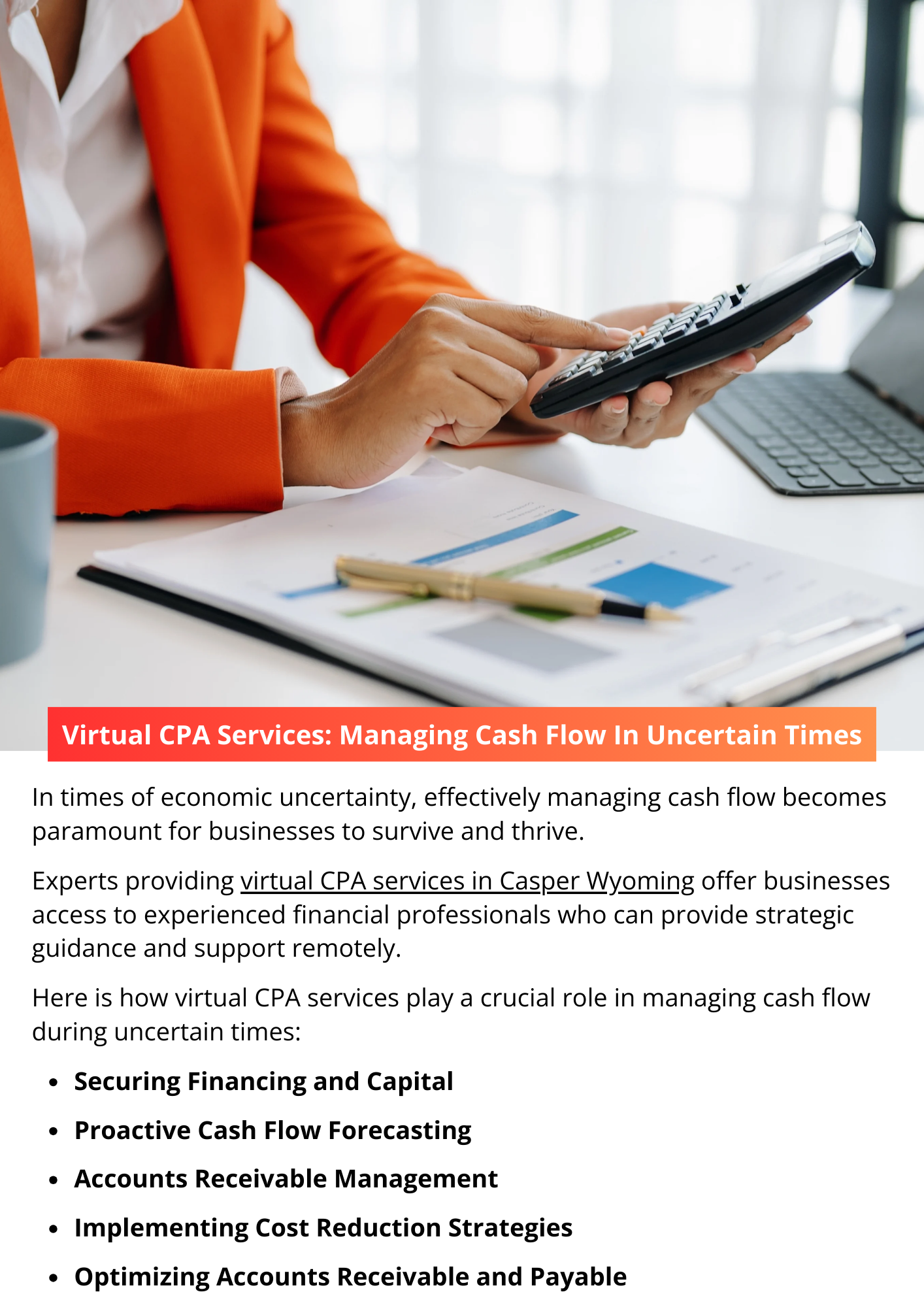 Virtual CPA services play a vital role in helping businesses manage cash flow effectively during uncertain times. By leveraging technology and expertise, virtual CPAs empower businesses to forecast cash flow, optimize accounts receivable and payable, implement cost reduction strategies, and secure financing and capital. To know more visit here https://www.straighttalkcpas.com/cpa-services-casper-wyoming