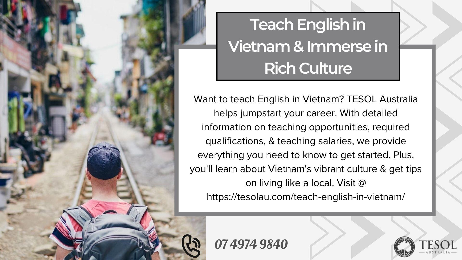 Want to teach English in Vietnam? TESOL Australia helps jumpstart your career. With detailed information on teaching opportunities, required qualifications, and teaching salaries, we provide everything you need to know to get started. Plus, you'll learn about Vietnam's vibrant culture and get tips on living like a local. Visit us now!