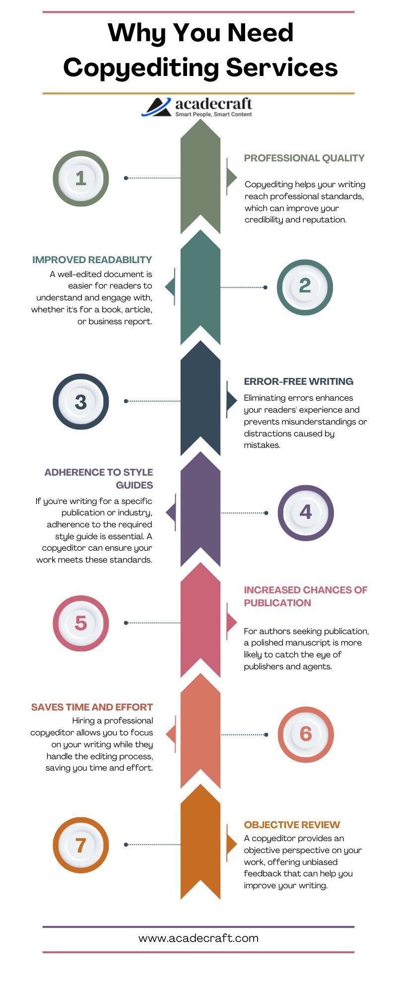 Copyediting services polish your content to ensure professionalism, coherence, and clarity. They ensure that your style and tone are appropriate for your audience and the requirements of the publication, and they fix spelling, grammatical, and punctuation mistakes. Copyeditors create more effective, succinct material by rearranging sentences and getting rid of unnecessary words. Their fact-checking and enhancement recommendations boost your credibility and publication prospects. Copyediting is an investment that will save you time and guarantee that your work is edited to the best of its ability.