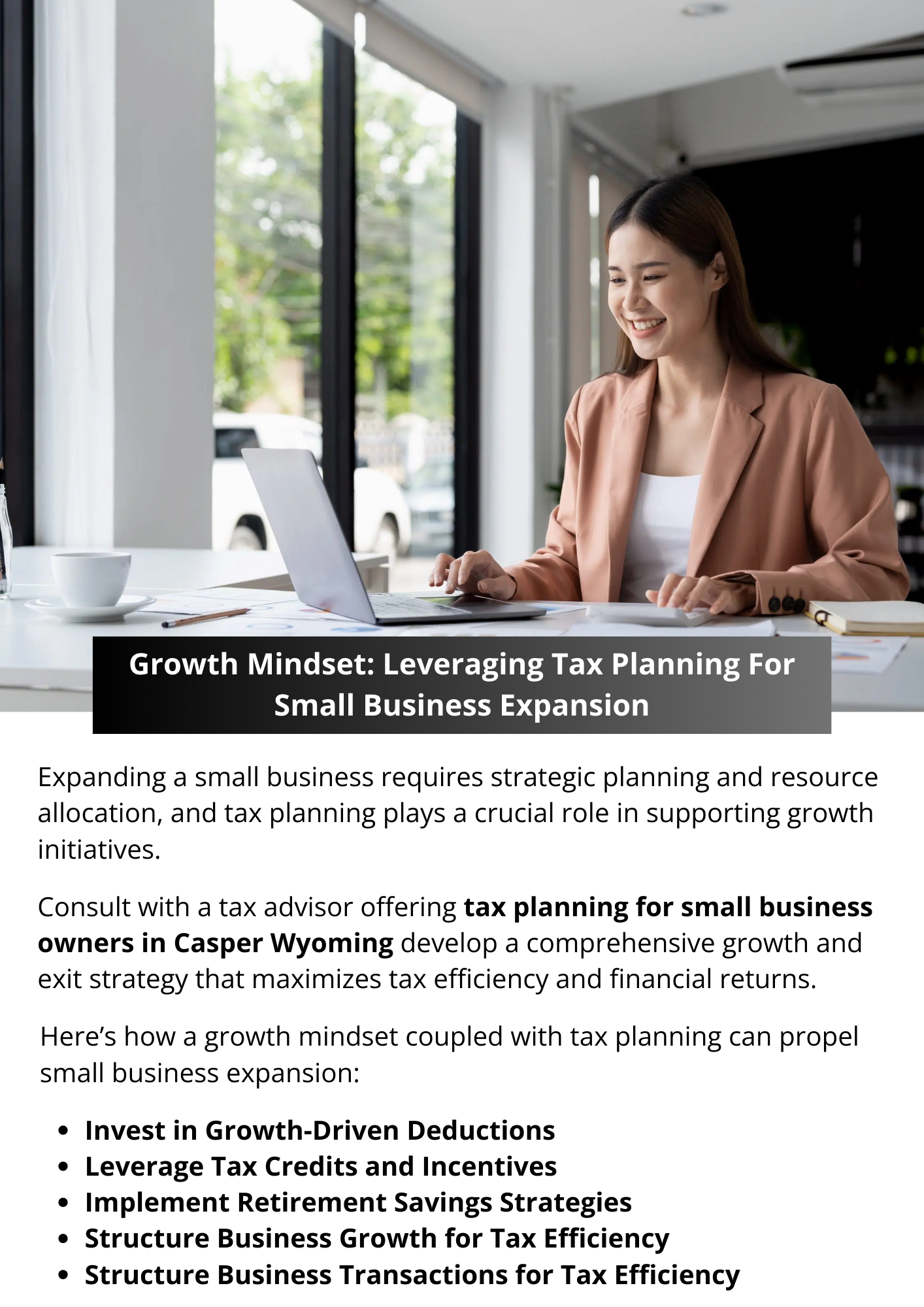 A growth mindset coupled with strategic tax planning is essential for fueling small business expansion. By investing in growth-driven deductions, structuring the business for tax efficiency, leveraging tax credits and incentives, implementing retirement savings strategies, structuring business transactions strategically, and planning for long-term growth and exit strategies, small businesses can maximize financial resources and minimize tax liabilities. To know more visit here https://www.straighttalkcpas.com/business-tax-planning-casper-wyoming
