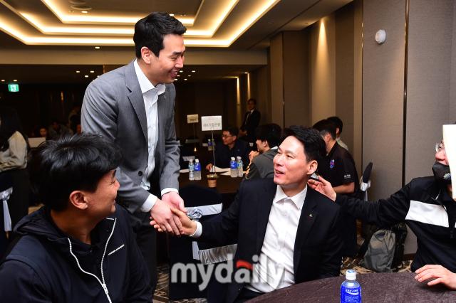 The two coaches met at the venue, shook hands happily, and exchanged greetings, saying, "Did you get home safely yesterday?" As Hyundai E&C's Wipawaii and Chunggwanjang Mega renewed their contracts the previous day, Kang Sung-hyung and Ko Hee-jin were able to comfortably drink soju ahead of the draft.