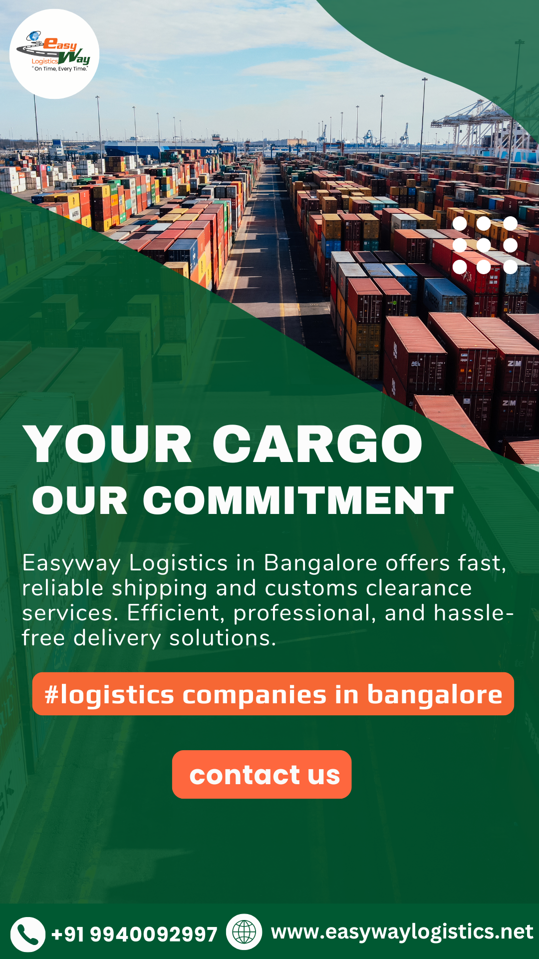 EasyWay Logistics is one of the top logistics companies in Bangalore, offering reliable transportation, warehousing, customs clearance, air and sea freight services. We provide fast delivery, real-time tracking, and cost-efficient supply chain solutions for businesses of all sizes. Kindly visit Website: https://easywaylogistics.net/ , For quick assistance, call 099400 92997