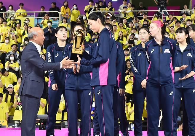 Despite this, Kim still could not overcome her challenge of winning the title again. She fought with Hyundai Engineering & Construction until the last minute of the regular season, but ended up losing the title, and had to turn around after not winning a single match in three consecutive full-set matches in the championship game. Kim looked quite stiff as she was taking a photo with the runner-up trophy.