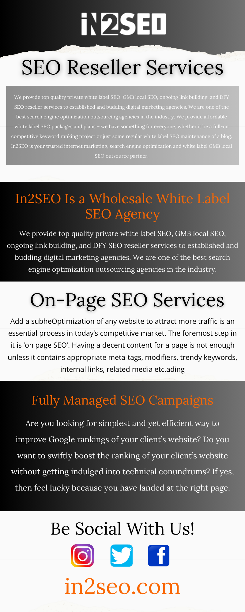 In2SEO is a wholesale white label SEO Agency that provides top quality private label SEO, GMB local SEO, ongoing link building, and SEO reseller services to established and budding digital marketing agencies. We are one of the best SEO outsourcing agencies in the industry in terms of quality of services. We provide affordable white label SEO packages and plans. In2SEO is your trusted internet marketing and search engine optimization partner. Contact In2SEO if you are looking for affordable internet marketing programs for your outsourcing company.