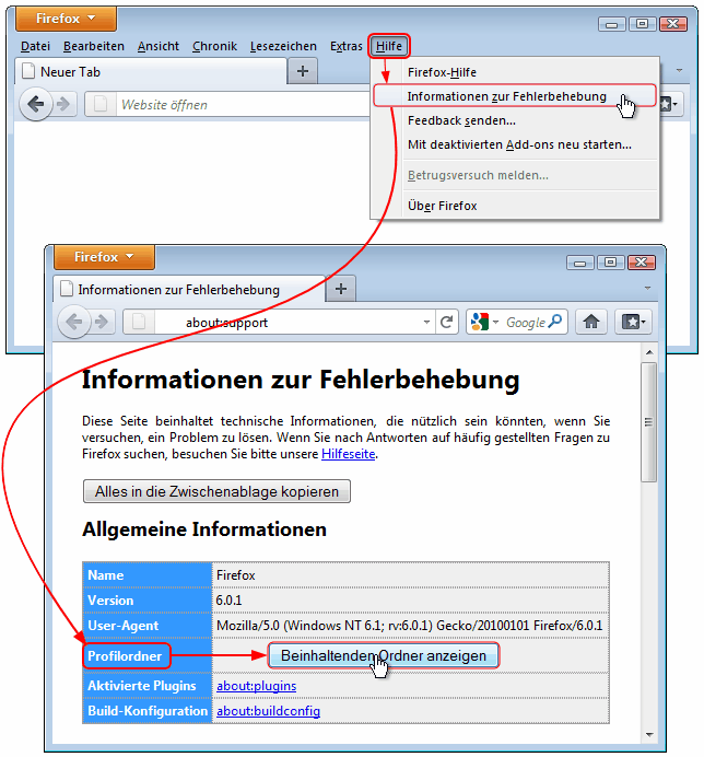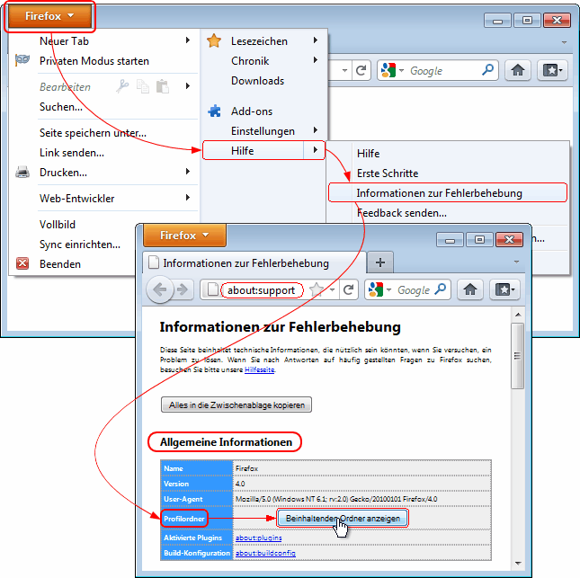 dann... Hilfe ➜ Informationen zur Fehlerbehebung ➜ [Ordner anzeigen]