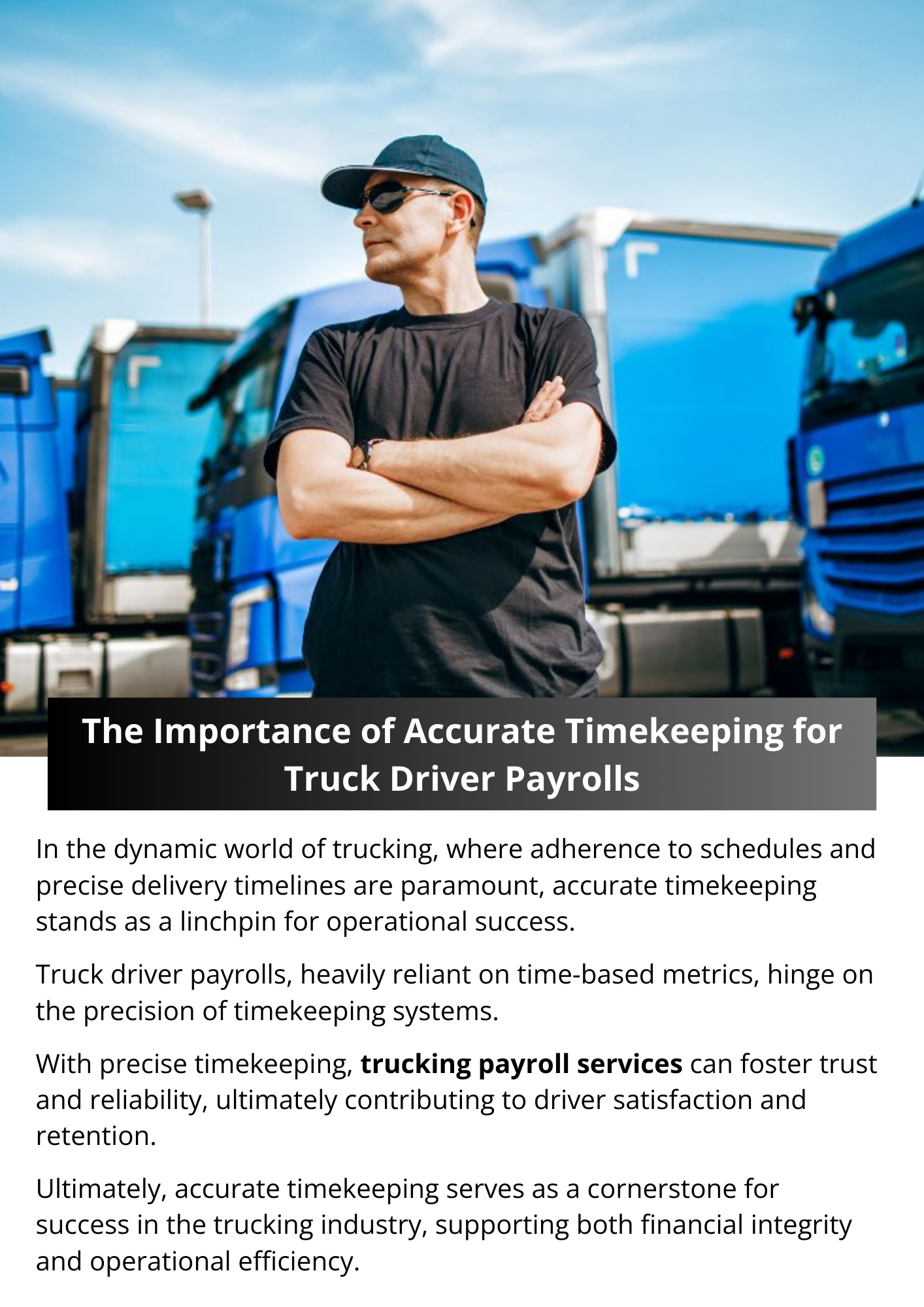 Accurate timekeeping for truck driver payrolls is paramount for ensuring fairness, compliance, and operational efficiency. Precision in tracking hours worked, rest breaks, and administrative tasks ensures that drivers receive proper compensation and adheres to regulatory requirements such as Hours of Service (HOS) rules. Transparent timekeeping fosters trust between drivers and companies, leading to higher satisfaction and retention rates. To know more visit here https://www.truckersprocpa.ca/trucking-payroll-services