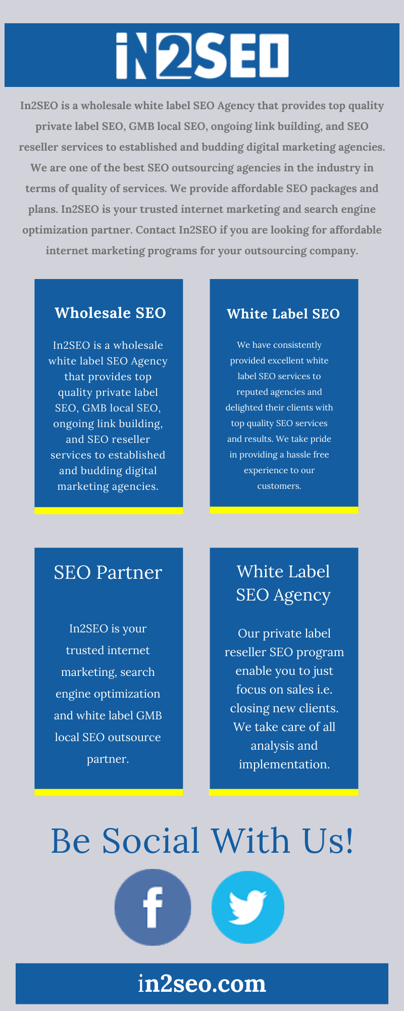 In2SEO is a wholesale white label SEO Agency that provides top quality private label SEO, GMB local SEO, ongoing link building, and SEO reseller services to established and budding digital marketing agencies. We are one of the best SEO outsourcing agencies in the industry in terms of quality of services. We provide affordable white label SEO packages and plans. In2SEO is your trusted internet marketing and search engine optimization partner. Contact In2SEO if you are looking for affordable internet marketing programs for your outsourcing company.