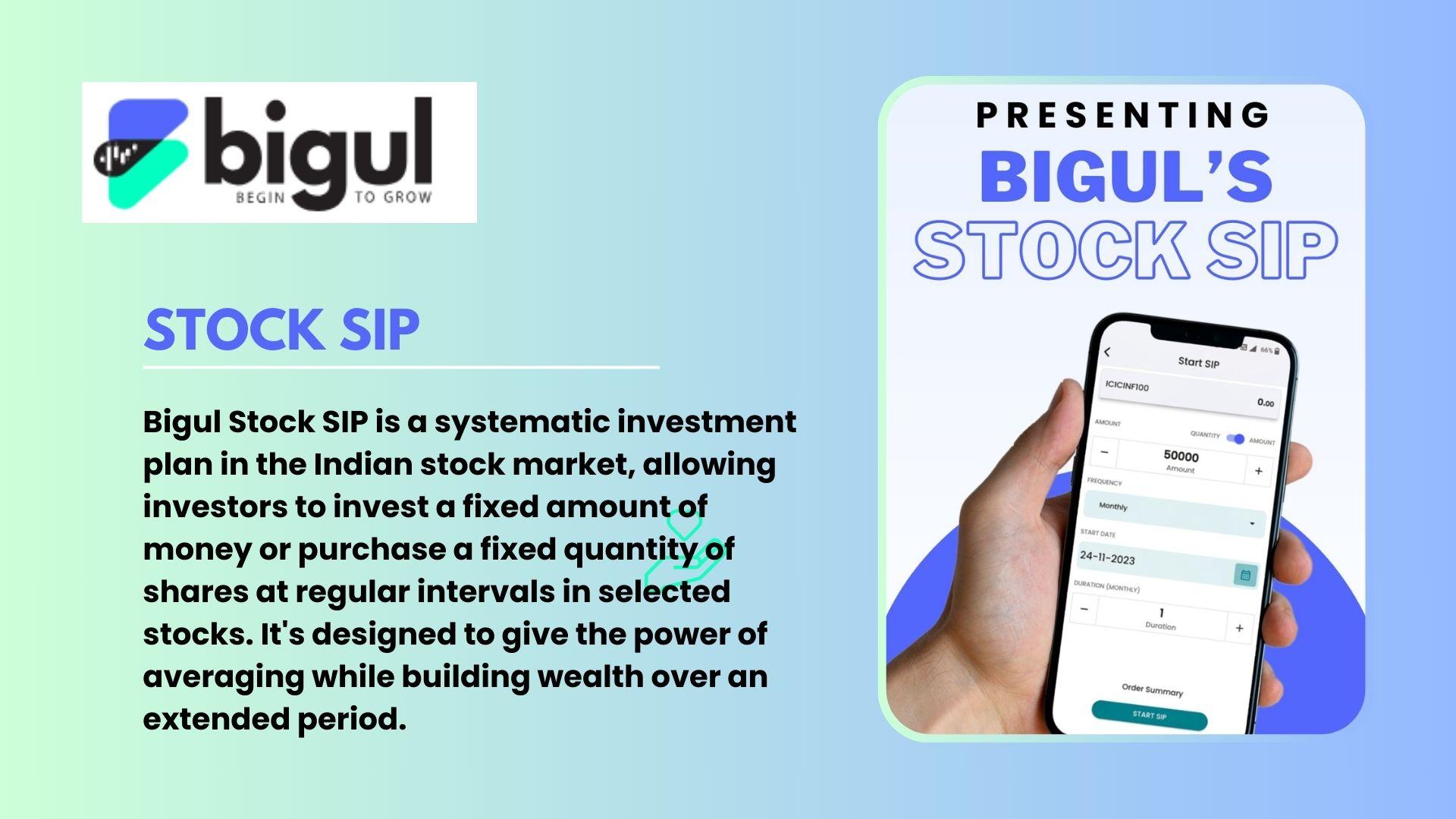 Stock SIP is the same as normal SIP, but in-stock Investors invest a fixed amount or a fixed quantity of stocks at regular intervals. As an investor, you can choose intervals for the investments, such as every day, every week, every two weeks, or every month, based on how much you can invest. We are Introducing the Bigul Stock SIP, an investment strategy in the stock market that lets you systematically invest a predetermined sum of money or a certain quantity of stocks at a regular interval period in a particular chosen share. In this process, you select a specific number of shares to be purchased or a certain amount to be invested at a regular interval. Start your Stock SIPs with Bigul's Trading App.