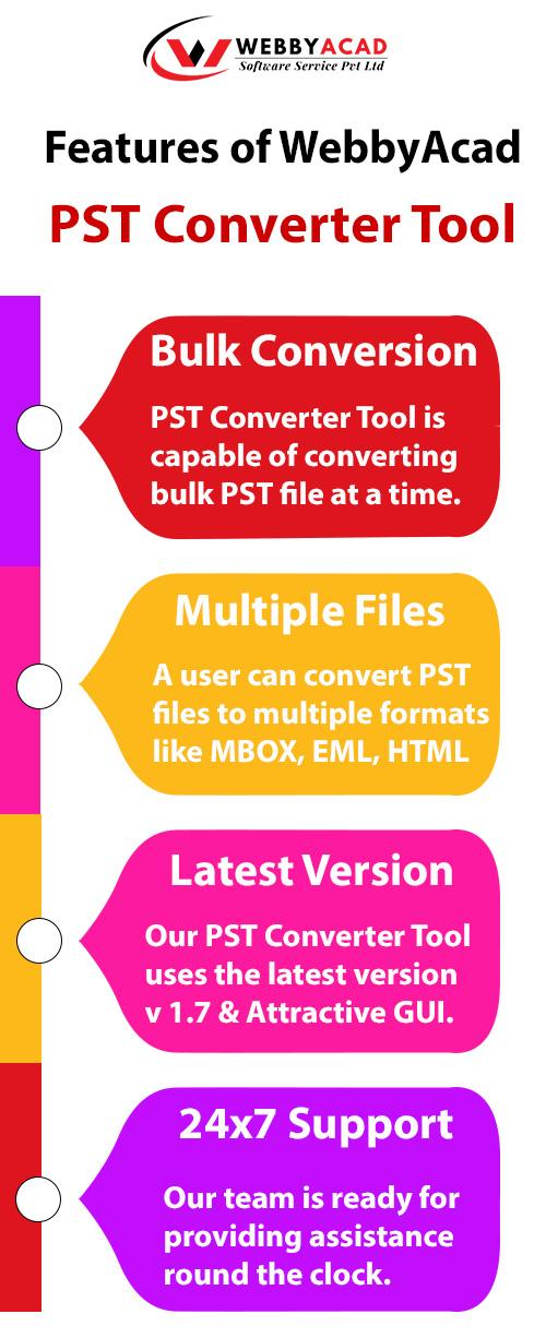 A PST Converter Software is a very useful software if you want convert your PST files to another formats. It can convert PST files to MBOX, EML, EMLx, HTML, DF, TGZ, EDB, CSV, MSG, MSF, ZDB etc. So, the features of a PST converter are: