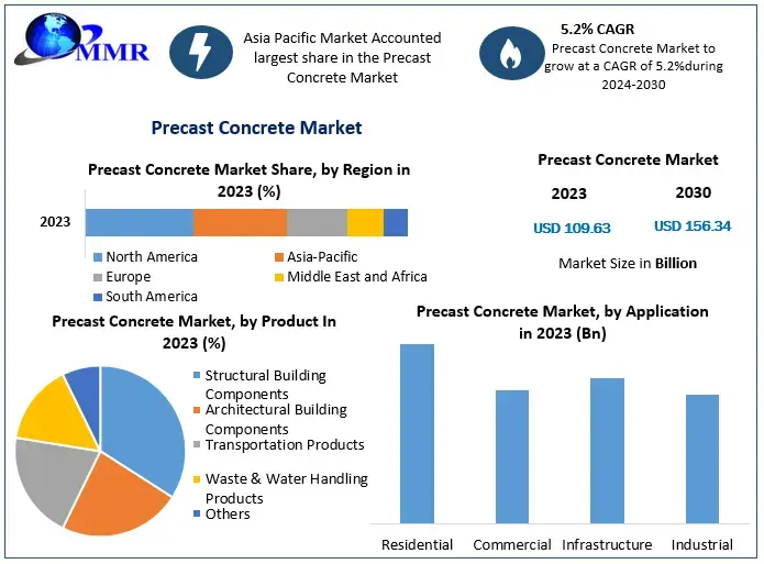 Precast Concrete Market was valued at USD 109.63 Billion in 2023, and it is expected to reach USD 156.34 Billion by 2030, exhibiting a CAGR of 5.2 % during the forecast period (2024-2030)