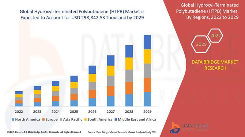 The growing demand for innovative aerospace components significantly impacts the expansion of the market for hydroxyl-terminated polybutadiene (HTPB). In line with this, the gaining popularity of hydroxyl-terminated polybutadiene (HTPB) in the automotive industry, and increasing demand for consumer electronic goods, are key determinants favoring the growth of the hydroxyl-terminated polybutadiene (HTPB) market during the forecast period. Data Bridge Market Research analyses that the hydroxyl-terminated polybutadiene (HTPB) market is expected to reach USD 298,842.53 thousand by the year 2029, at a CAGR of 6.6% during the forecast period. "Aerospace & defense" accounts for the most prominent end-use segment in the respective market owing to the demand for HTPB adhesives and binders in various industries such as automotive, construction, and other industries. The market report curated by the Data Bridge Market Research team includes in-depth expert analysis, import/export analysis, pricing analysis, production consumption analysis, and climate chain scenario.