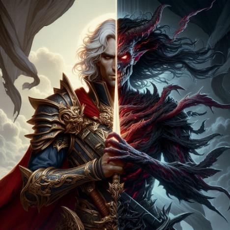 Fantasy art, paizo style, defined lines, ultra realistic shading, ultra-detailed, HD, thematic color wash, realism, realistic style, otherworldly and cinematic aesthetics, intricate detail. A handsome male fantasy hero holding a sword, corrupted by evil. half the picture good, half bad, dynamic pose.