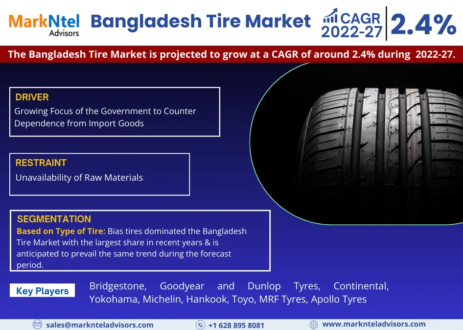 As per recent research by MarkNtel Advisors, The Bangladesh Tire Market is projected to grow at a CAGR of around 6% in terms of revenue during the forecast period, i.e., 2022-27.