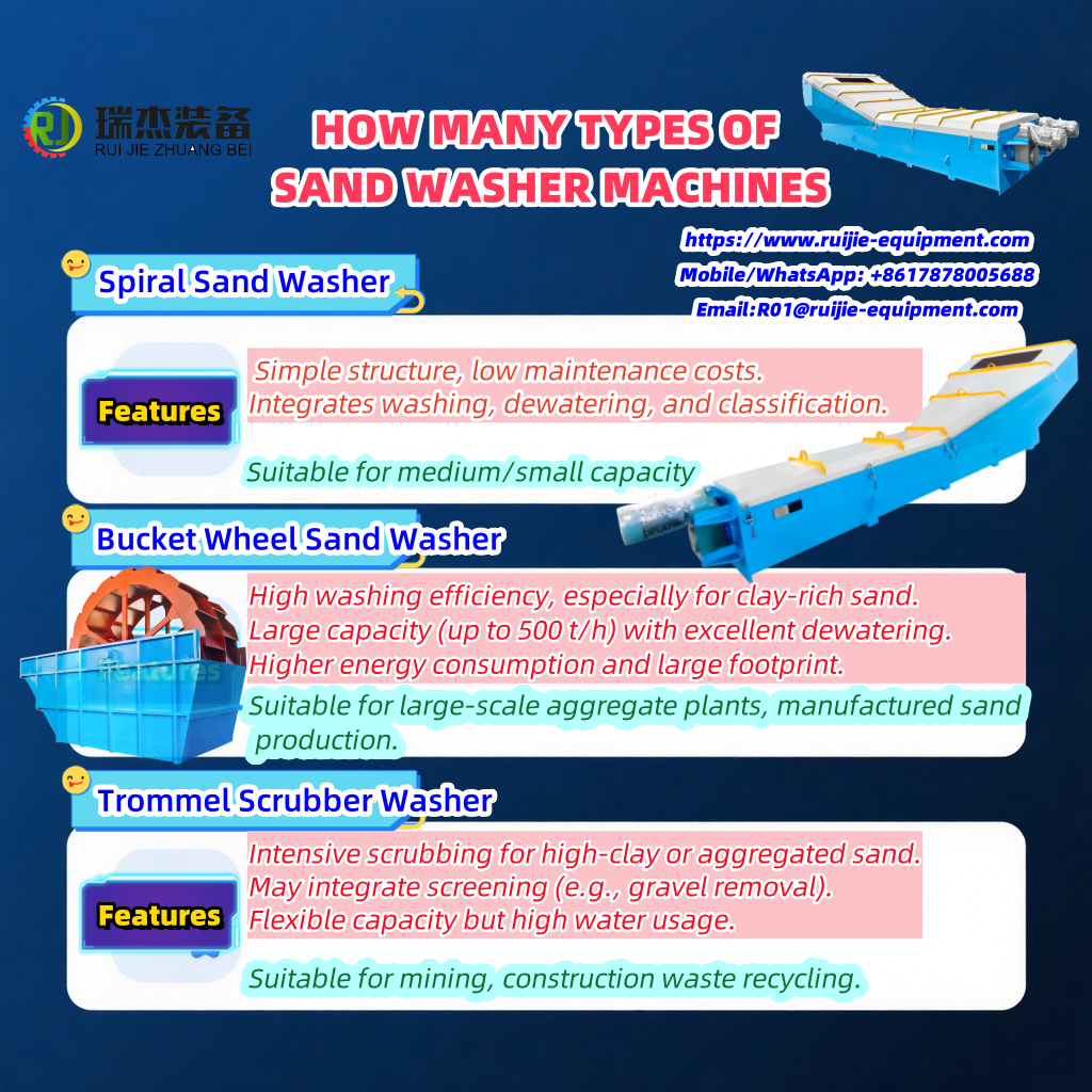There are several types of sand washers available, each with unique features. The most common ones include spiral sand washers, bucket wheel sand washers, and trommel scrubber. Besides, there are vibrating sand washer, combined sand washing systems.