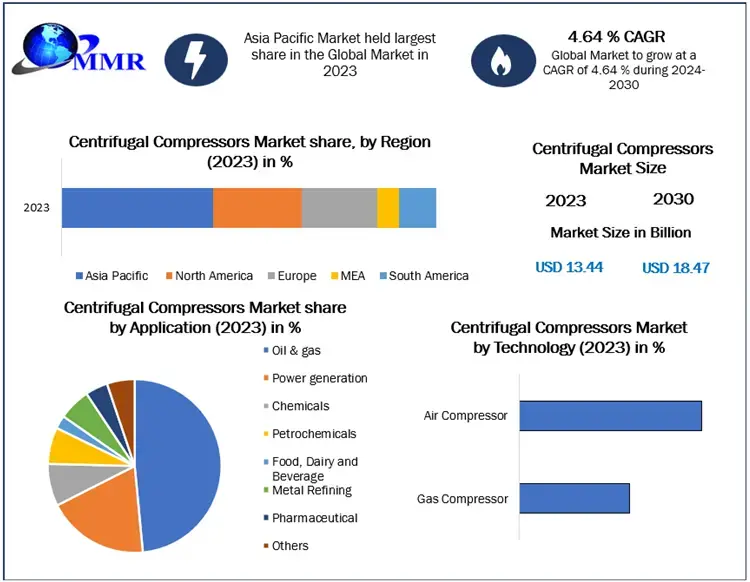 Centrifugal Compressors Market was valued at USD 13.44 Bn in 2023 and is expected to reach USD 18.47 Bn by 2030, at a CAGR of 4.64% during the forecast period.