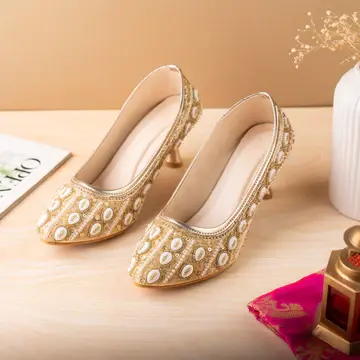 Shell heels come in soft palettes — peach, ivory, color pink — and are frequently combined with plums or hand embroidery. These details give the juttis a romantic sense, perfect for day functions and haldi observances.