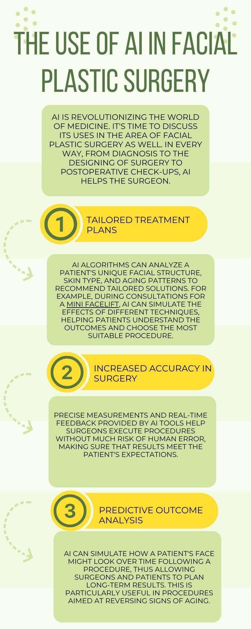 AI is revolutionizing the world of medicine. It's time to discuss its uses in the area of facial plastic surgery as well. In every way, from diagnosis to the designing of surgery to postoperative check-ups, AI helps the surgeon.