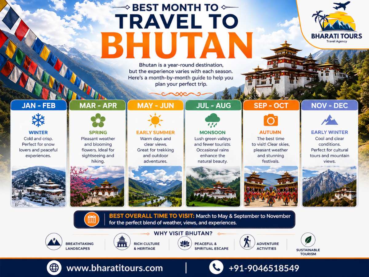 Discover the Best Month to Travel to Bhutan with expert guidance from Bharati Tours. Plan your journey during spring or autumn for clear skies, festivals, and scenic beauty. We offer customized Bhutan tour packages with seamless travel support, ensuring a hassle-free experience. Whether you seek culture, adventure, or relaxation, choose the right time to explore Bhutan’s charm. Book your Bhutan trip with Bharati Tours for an unforgettable travel experience.