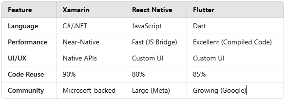 Both are great for cross-platform development, but Xamarin uses C# and .NET, while React Native is based on JavaScript. Xamarin is better for apps requiring high performance and native UI.