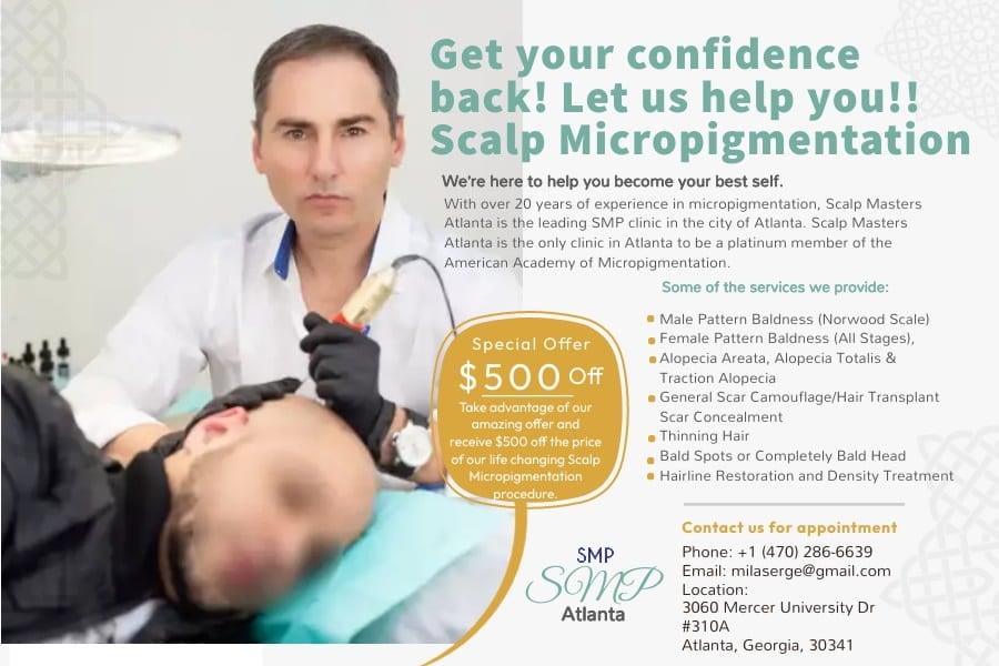 Scalp Masters Atlanta is one of the most reputable scalp micropigmentation clinic in Atlanta and serves its clients spread across Georgia, Alabama, Tennessee and the Carolinas choose Scalp Masters for the finest hair loss treatments available. Book a FREE SMP Consultation with us to understand more on your need, hair loss pattern and area to cover with the effect you want to achieve. Call us today at 1 (678) 539-6864 or visit http://www.smpatlanta.com. Let our Scalp Master Serge Bovbalan and Milla Rosen work together with you to achieve the best results.