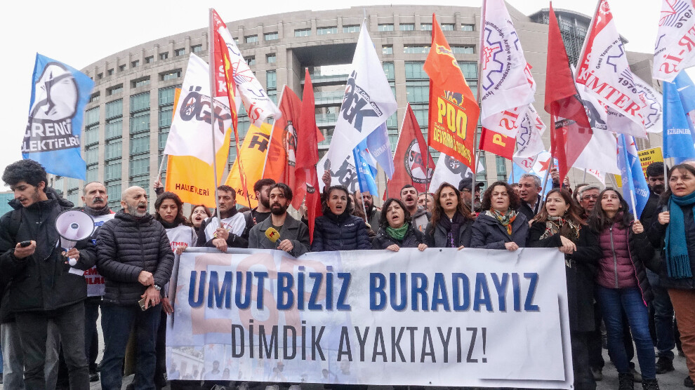 Ezilenlerin Sosyalist Partisi’ne (ESP) yönelik siyasi kırım operasyonuyla gözaltına alınan 94 sosyalistten 55’inin savcılık ifadesi alınmadan tutuklama talebiyle sulh ceza hakimliğine sevk edildiği Çağlayan Adliyesi önünde açıklama yapıldı. DEM Parti milletvekilleri Çiçek Otlu, Özgün Saki, DEM Parti İstanbul İl Eşbaşkanları Arife Çınar ve Çınar Altan’ın hazır bulunduğu açıklamaya, çok sayıda siyasi parti, sendika, demokratik kitle örgütü temsilcisi katıldı.