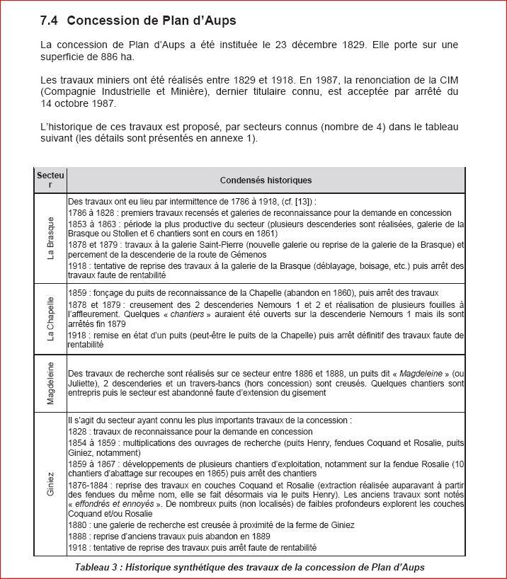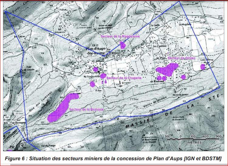 A Plan d'Aups des travaux de recherche et d'exploitation dans le cadre de la concession accordée en 1829 sont connus à la Brasque, à la Chapelle, à Magdeleine et à Giniez. Il y a très peu de données précises sur ces sites et très peu de restes visuels. Les données qui restent sont connues grâce à une étude "d'aléas possibles après mine" de Geoderis, une structure créée par le ministère de l'écologie, la DREAL, le BRGM et l'INERIS. La DREAL remplace le service des Mines. Cette étude est disponible ici. Une grande partie de ce qui suit est tiré de cette étude.