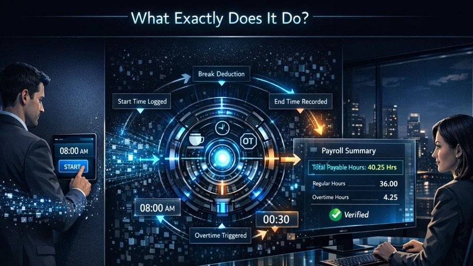 At its core, this system converts timestamps into accurate payable hours. Employees record when they start and finish work, and the software calculates the difference. Breaks can be deducted, overtime rules applied, and totals summarized without manual intervention.