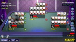 Seperti contoh pada gambar , pemain dkiri berhasil mendapatkan scoop terhadap dua lawannya (scoop juga bisa ddapatkan jika ia hanya menang dari salah satu lawan). Ketiga baris milik pemain dkiri menang terhadap ketiga baris dari kedua lawannya. Oleh karena itu, pemain dsebelah kiri mendapatkan bonus +6 point dan masing-masing lawan dikurangi 3 point. Dkarenakan meja tersebut memiliki nilai nominal sebesar 100, maka pemain dkiri mendapatkan 1200 credit.