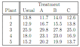 2. Transistor Inc. wants to investigate the effectiveness of an additional chemical bath treatment on the yield of server-grade devices. They try three new treatments, as well as their usual process. The table below lists the percentage yield of server-grade devices, for five different production plants.