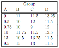 1. In order to investigate the effectiveness of training programmes preparing new employees for routine tasks, 24 new employees (with the same background knowledge and experience) were randomly divided into 4 groups. Each group followed a different training programme. The table below shows the time (in hours) for each new employee to successfully complete the same test suite of routine tasks.